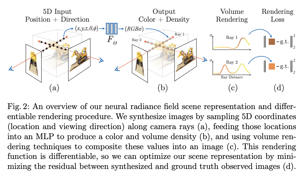 이러한 process는 미분 가능(differentiable) 하기 때문에 우리는 각 관찰된 이미지와 해당하는 views 사이의 에러를 줄이면서 모델을 최적화하기 위해 gradient decent를 사용할 수 있다.