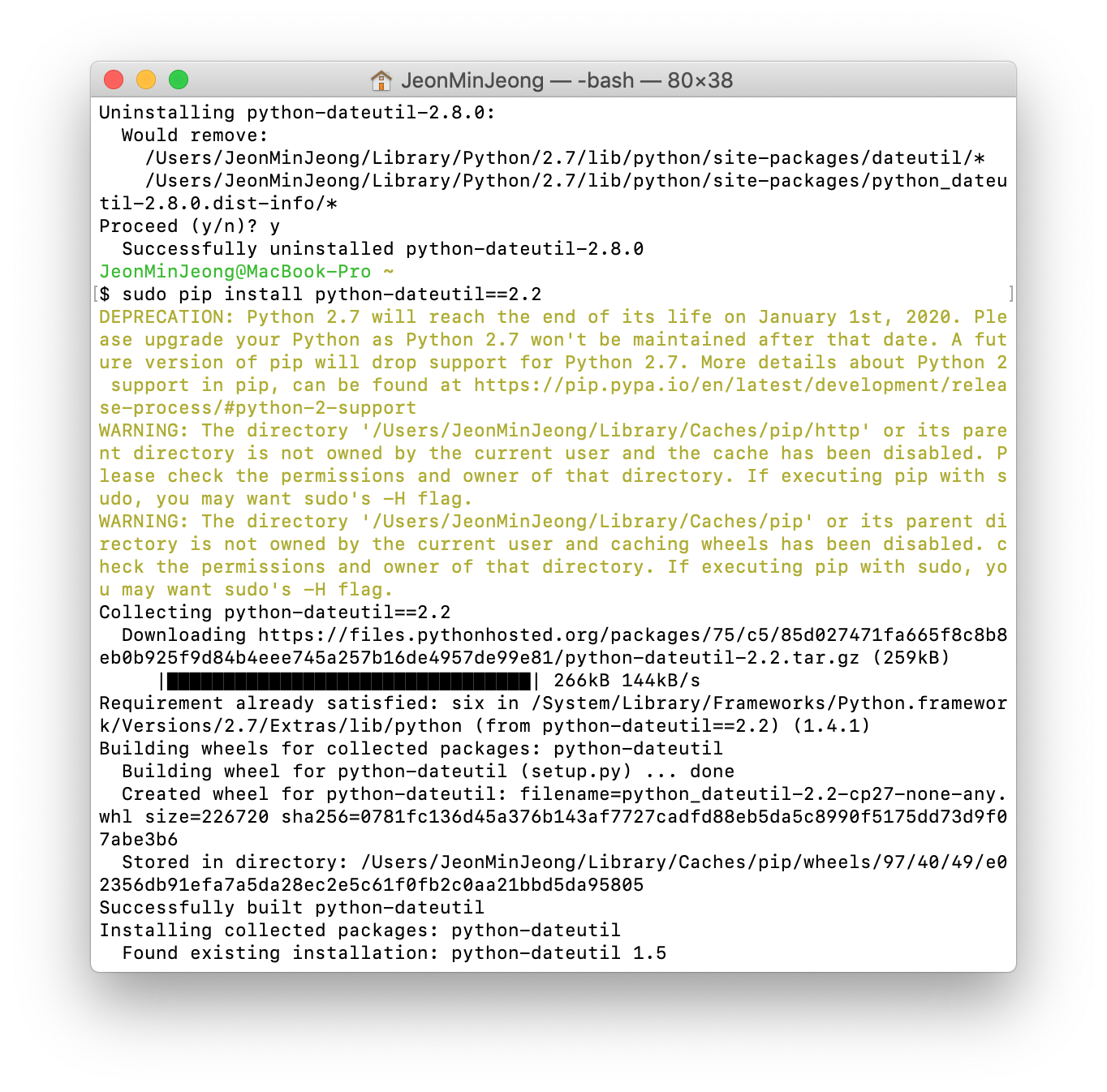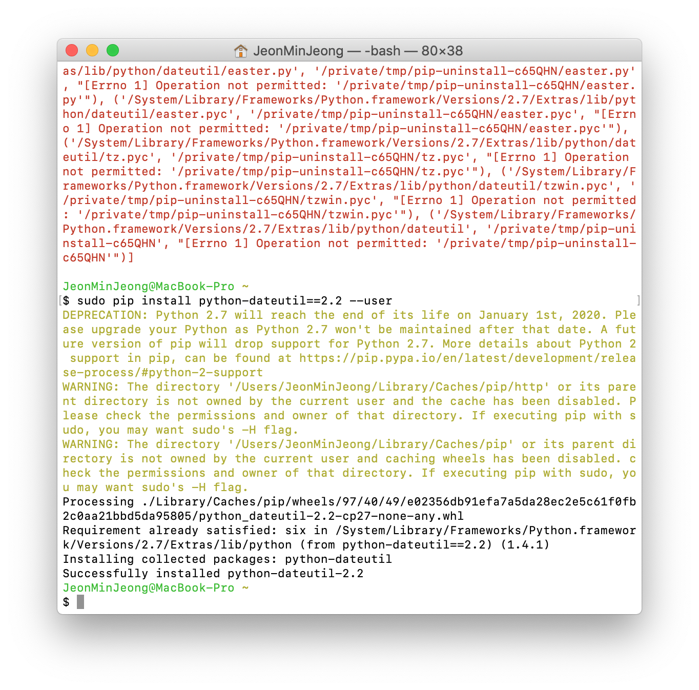 지우고 다시 설치. (--user) 이용