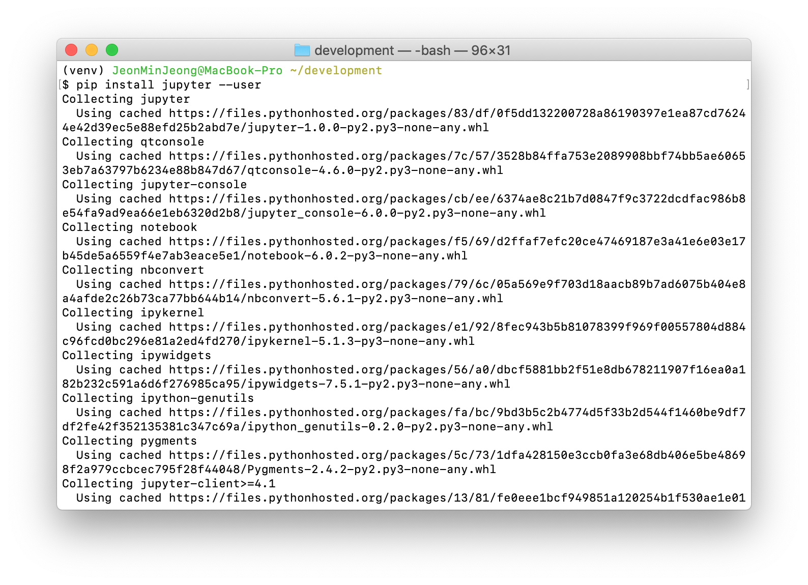 원래는 --user 옵션 없이 했었는데 오류나서 그냥 해당 유저만 사용하도록 설정해서(위의 캡쳐처럼 --user 옵션사용) 설치하였다.